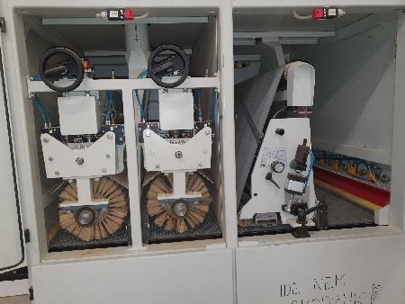 typ BSM 1100 PBB, pro broušení rámových obrobků mezi lakem, specifikace: š 1100mm, 1. agregát - elektronicky řízená pneumatická patka, 2. a 3. agregát - kartáč tzv Scotch Brite, plynulá regulace posuvu a otáček, r.v. 2005, cena 9000,-Eur+DPH, u zákazníka k předvedení a odzkoušení